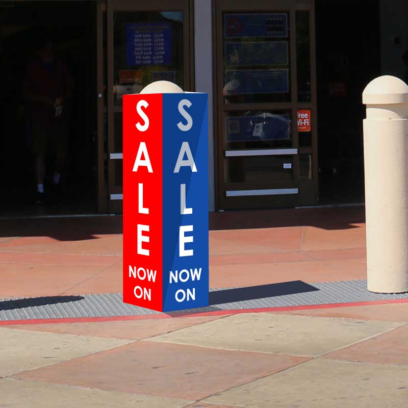 - Bollard Covers provide 360-degree visibility with four-sided panels allowing for great use of space. The multiple sided structure allows you to grab the attention of your target audience through both foot and car traffic. Take full advantage of this unique sign layout by repeating the same design on all 4 panels or mix it up to create a different message on each side of the bollard cover. Made from corrugated plastic, this lightweight material allows for easy installation and is water-resistant which makes for a perfect outdoor sign option for any retailer.