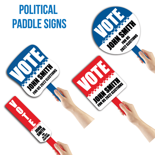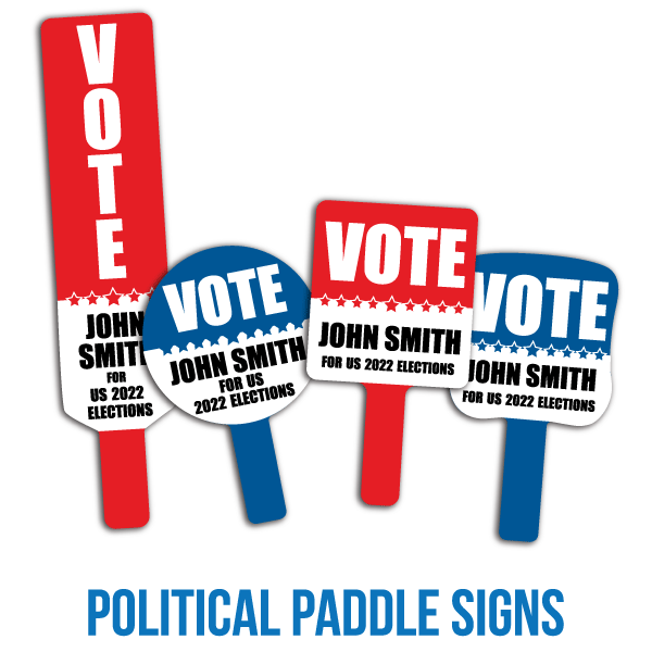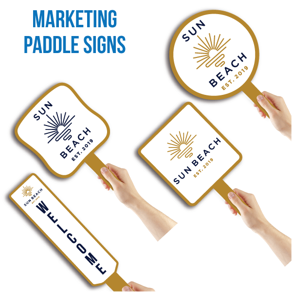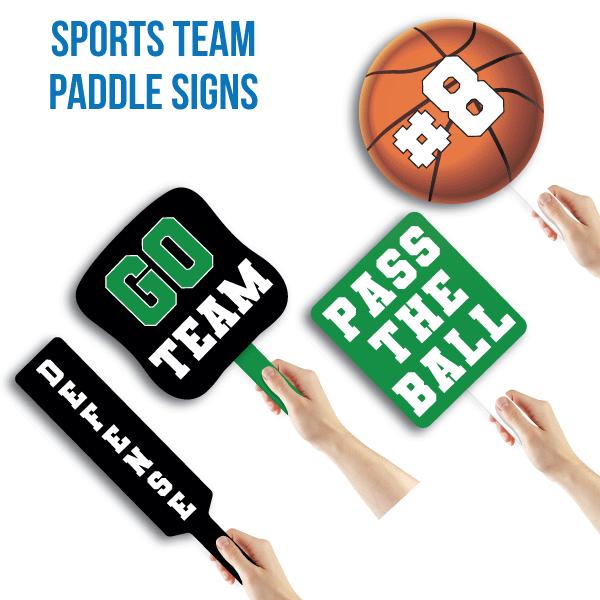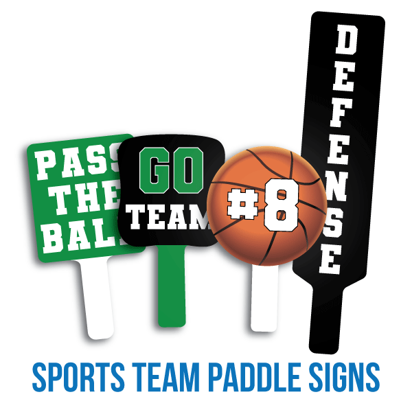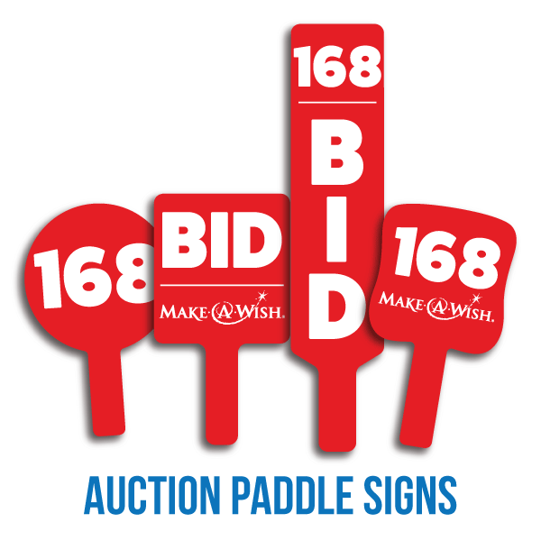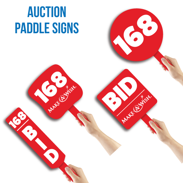 Handheld Paddle Signs, also known as rally fans, made from corrugated plastic, are a versatile and lightweight promotional option. They are a unique way to customize an event or gathering and are cost-effective since they are reusable and durable. Great for the auction bidding, or showing team spirit at a sporting event. There are also a variety of other applications such as event programs and weddings.