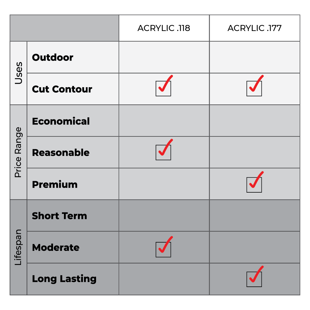 The thicker option adds durability and rigiidty but is slighty more expensive. Our .177 Arylic can also be used to create an artistic 3D signage. This materail does also have some flexability at larger sizes. We do recommend for large print that the center will need additional support due to its likeness of bending.