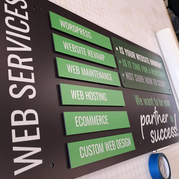 ACM is a polyethylene core with thin lightweight aluminum on both sides. This material is durable, and ideal for medium-term to long-term signs both indoor and outdoor. These signs can cut to different shapes and sizes. We can also include drilled holes for a variety of displaying options.