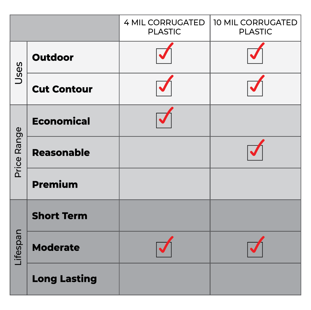 Corrugated Plastic is an extremly popular product becuase it is budget-friendly, easy to use, and very verstile. They can be used to create life size cutouts, paddle signs, stacakble boxes and of course lawn signs.