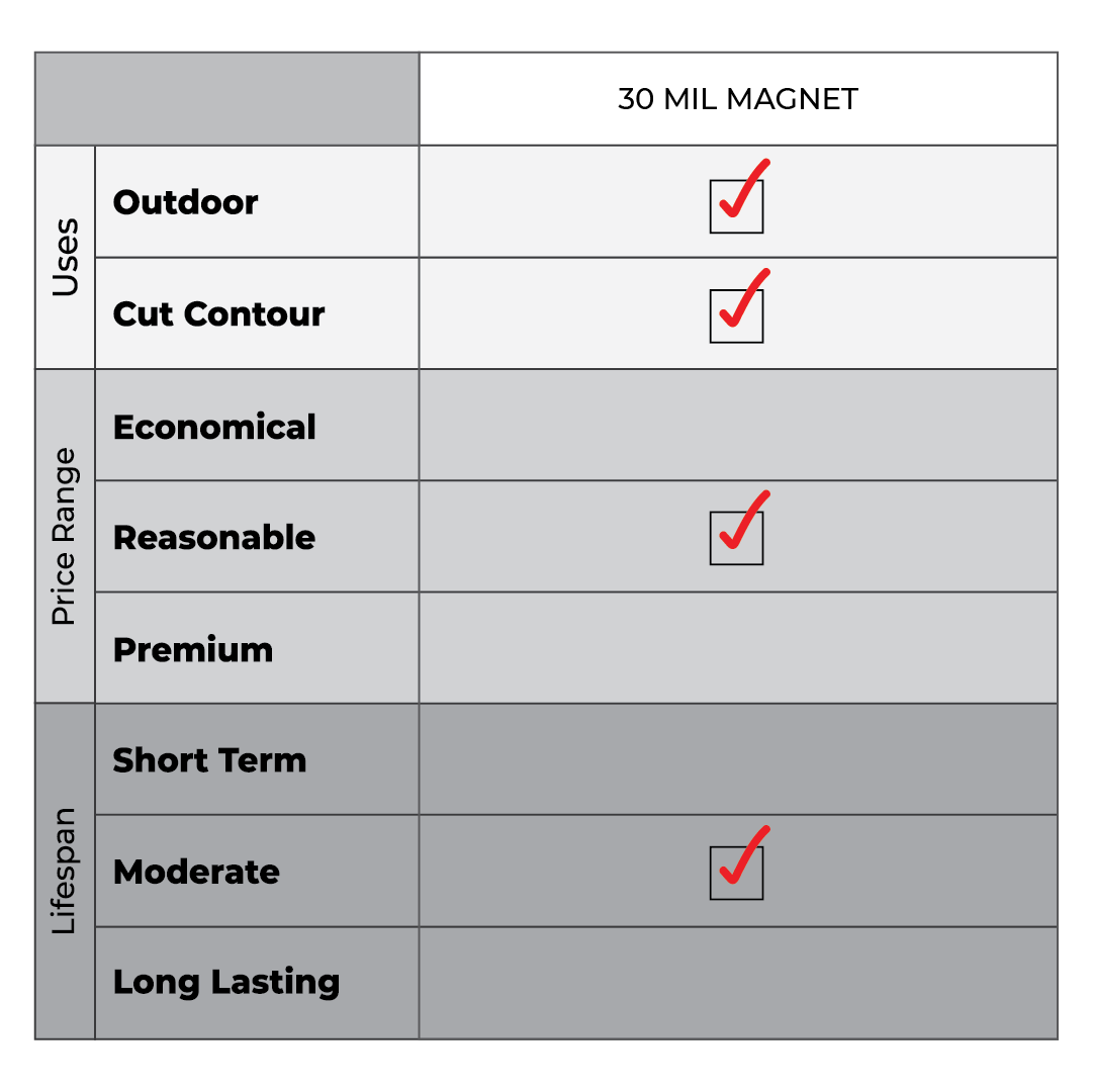 Our 30mil magnet material is durable, weather-resistant and requires little maintenance. Our magnets are made with a thicker material compared to our competitors to allow for a stronger and longer-lasting sign. Our magnet material works well as automobile signage, menu boards,  architectural signage and much more.  If cut/contour option is select then the final product will be cloud cut. Please NOTE it does not stick to ALUMINUM.