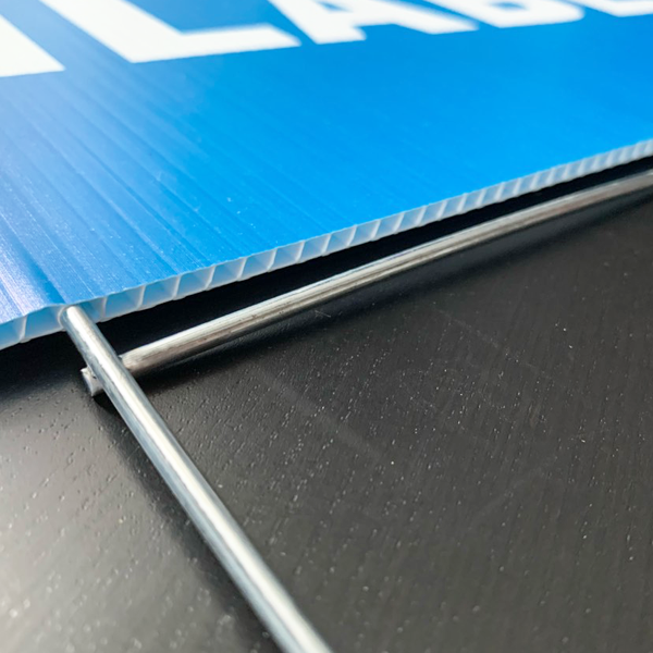 Our Yard Sign Kit includes 1 H-Stake per lawn sign. The wire H-Stakes are placed in your sign vertically and inserted into the ground surface. The rods slide directly into the vertical flutes and the bottom rods go into the ground. Each wire stand is made of 9 gauge steel with a galvanized finish.